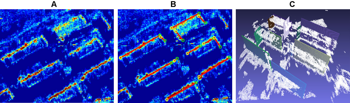 Facade detection from initial 3D points. (A) Projection map generation; (B) line segment detection; (C) facade generation.