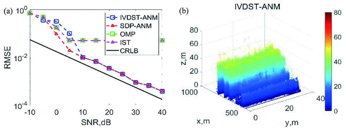 Performance comparison of IVDST-ANM and other state-of-art technology, and reconstruction result of urban areas. (a) RMSE versus SNR by different method. (b) Reconstructed point cloud by IVDST-ANM.