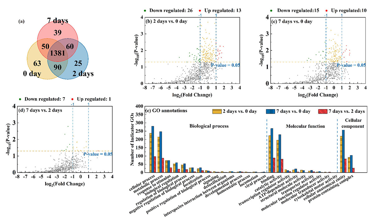 Number of identified proteins of EPS from E. coli MG1655 without and with the starvation for 2 and 7 days (a); the number of upregulated and downregulated proteins in the EPS from E. coli MG1655 under different starvation durations, comparisons were made between 2 days vs. 0 day (b), 7 days vs. 0 day (c), and 7 days vs. 2 days (d) starvation; number of differential proteins assigned to Gene Ontology (GO) terms in comparisons of different groups (e).