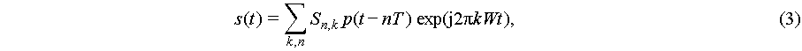 The transmission signal (2) is a special case of Eq. (3) when W = 1/T. If we sample time variable t in Eq. (3) and use the rectangular pulse, i.e., p(t) is the rectangular pulse of length T, for example, t = i, T = N and W = 1/N, Eq. (3) is an OFDM signal without cyclic prefix (CP), where k, {L-End}